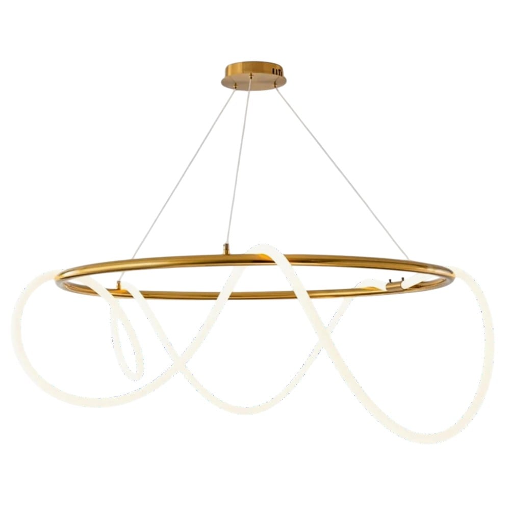 LED pendant light with 77W power, adjustable light temperature 3000–6400K and 6100 lm brightness. With a diameter of 60 cm and a height of 30 cm, made of aluminum and silicone with a gold finish, it combines powerful lighting with elegant design for modern environments.