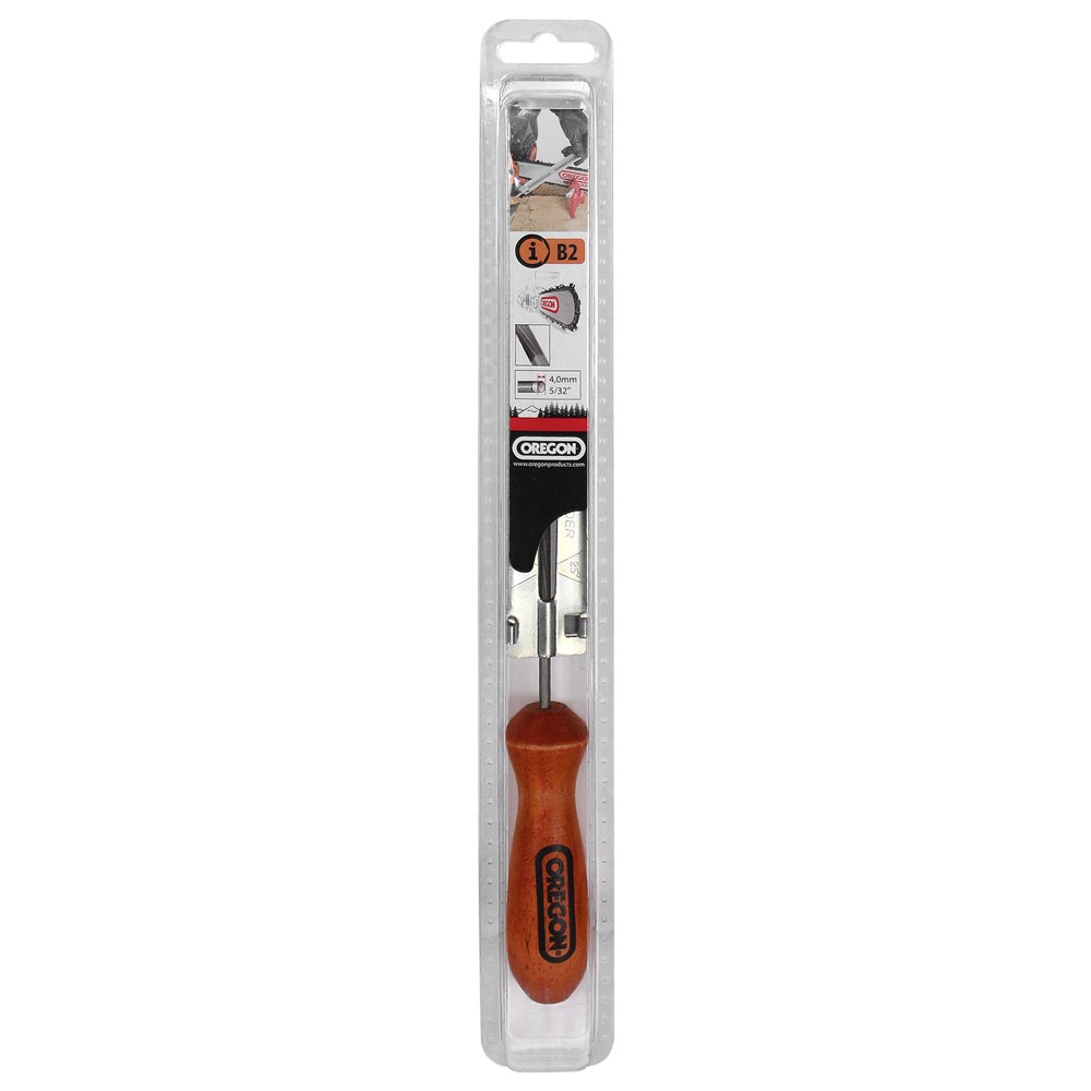 Tool guide for proper angle and depth of sharpening the chain, including rod