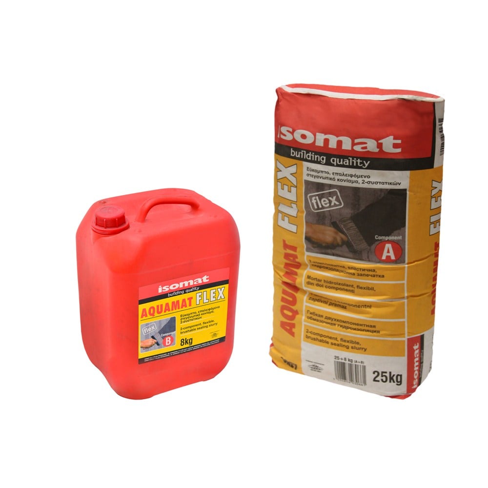 "AQUAMAT is a cement-based brushable sealing slurry, offering: @Total waterproofing against water pressure up to 7 atm, according to DIN 1048. @Perfect bonding to substrates like concrete, masonry, plaster, even under negative pressure conditions. @Suitability for potable water tanks as well as surfaces in direct contact with food products, according to W-347, EPA 330.5 and EPA 110.2. @Simple and low-cost application. @No corrosive effects on steel in reinforced concrete. @Low chromate level according to TRGS 613. Waterproofing of concrete elements, masonry or plaster surfaces, in cases ranging from simple moisture to water pressure. Suitable for waterproofing of basements, water tanks, swimming pools, sewage tanks, etc. Enables internal waterproofing of underground areas, since it can withstand negative pressure (water from the substrate side), due to its absolute bonding to the substrate. In cases that the surface to be sealed shows or is expected to show haircracks, like terraces, balconies etc., the 2-component brushable sealing slurries AQUAMAT-FLEX and AQUAMAT-ELASTIC are recommended. "