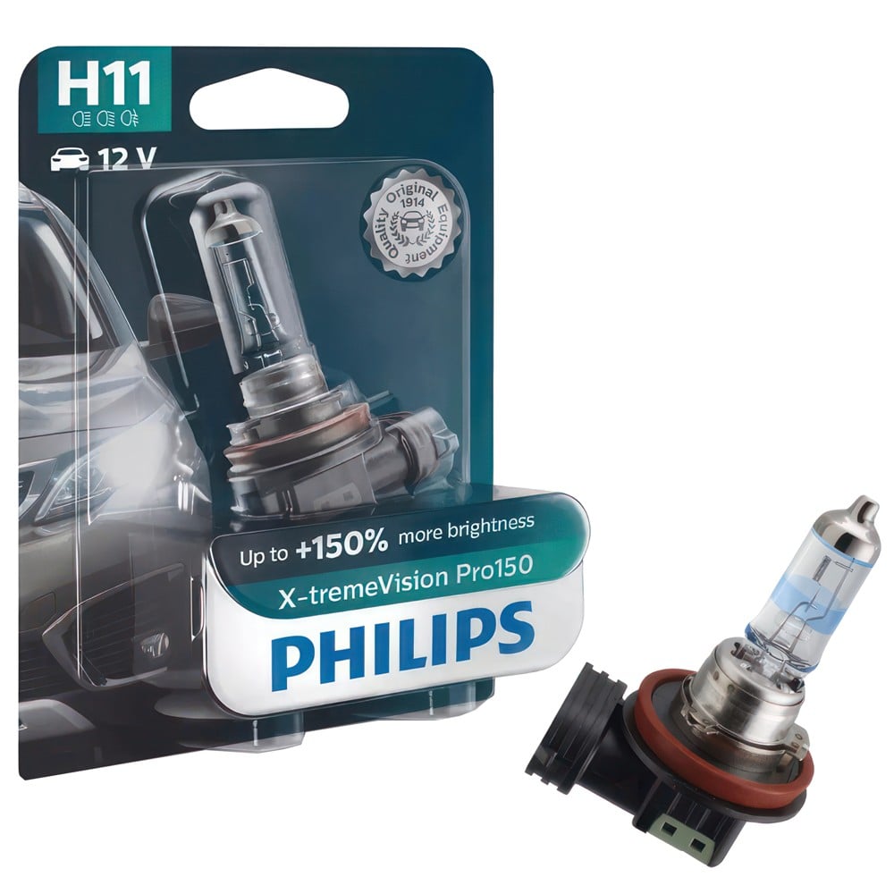 The best blend of high performance and lifetime See the road better with up to 150% brighter light Longer lasting for a lifetime of safety High-performance beam throws light 70 meters further More contrast and visibility with cool light Combining striking brightness with the kind of lifespan previously unavailable in such a high-performance bulb, Philips X-tremeVision Pro150 provides the visibility to keep you and your loved ones even safer on the road. Technology: Halogen Application: High beam/low beam Type: H11 Number of bulbs: 1 Life time: 400 hrs