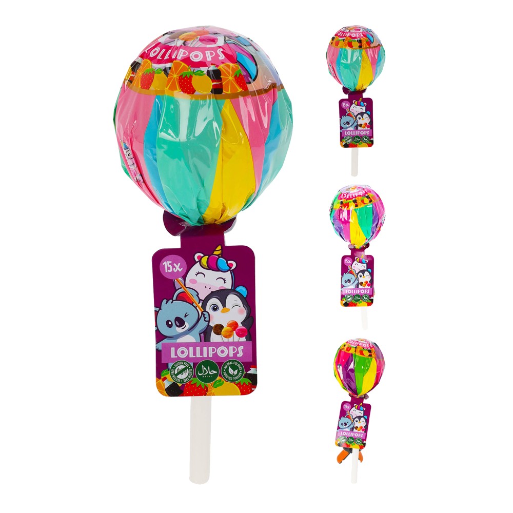 XL lollipop with animal figures, 15x135gr, with lemon, orange and strawberry flavors. Ingredients: glucose syrup (contains sulfites), sugar, flavoring, acidity regulator (E330, E296), color (E150d, E100, E162, E160c). May contain traces of: soy, milk, nuts.