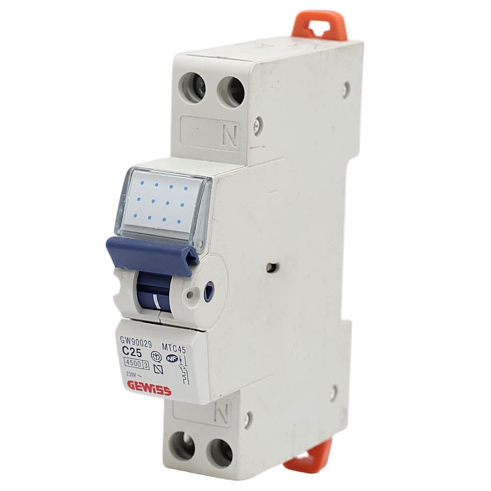 GEWISS magneto-thermal circuit breaker, 1P+N, 1 module, C, 25A, 4.5kA. This circuit breaker provides efficient protection for installations using one phase and one neutral (1P+N). With a capacity of 25A and a breaking capacity of 4.5kA, it is suitable for use in domestic, commercial or other applications with medium to high loads. The compact 1 module design ensures that this circuit breaker fits easily into smaller electrical panels, providing reliable and durable protection against overloads and magnetic discharges.