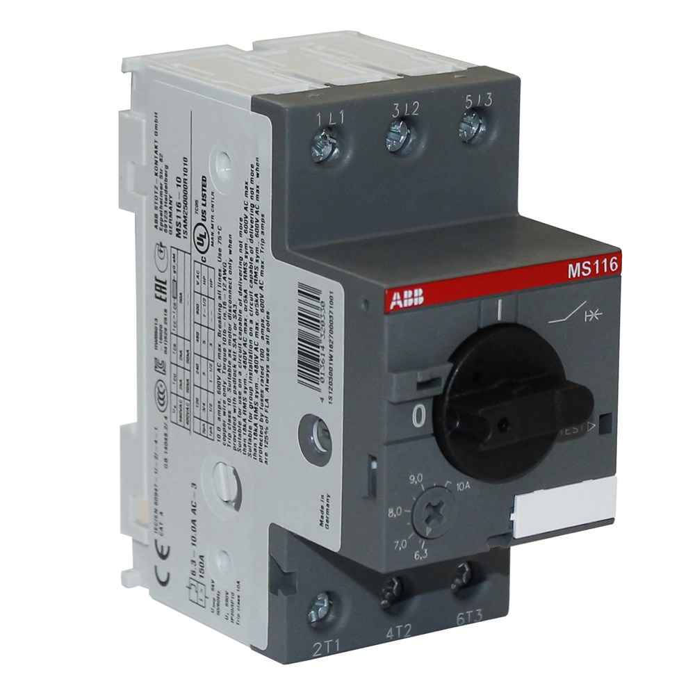 The MS116-10 manual motor starter is a compact 45 mm width devices with a rated operational current of Ie = 10.0 A. This device is used to manually switch on and off motors and to protect them reliably and without the need for a fuse from short-circuits,