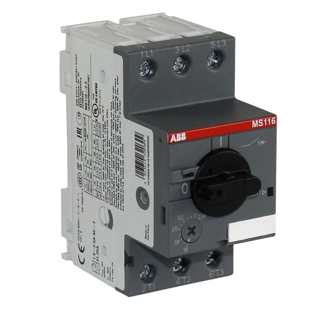 The MS116-2.5 manual motor starter is a compact 45 mm width devices with a rated operational current of Ie = 2.5 A. This device is used to manually switch on and off motors and to protect them reliably and without the need for a fuse from short-circuits,