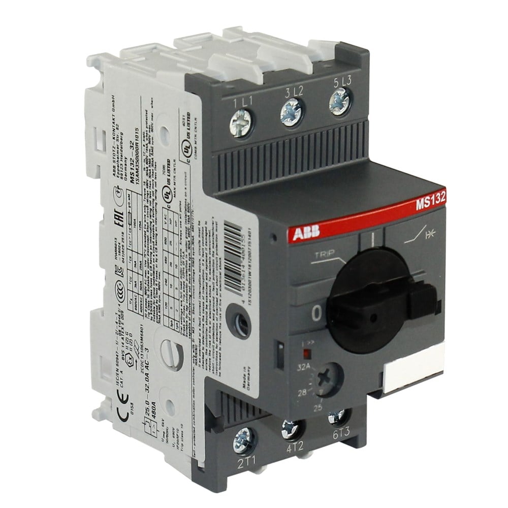 The MS132-32 manual motor starter is a compact 45 mm width devices with a rated operational current of Ie = 32.0 A. This device is used to manually switch on and off motors and to protect them reliably and without the need for a fuse from short-circuits,