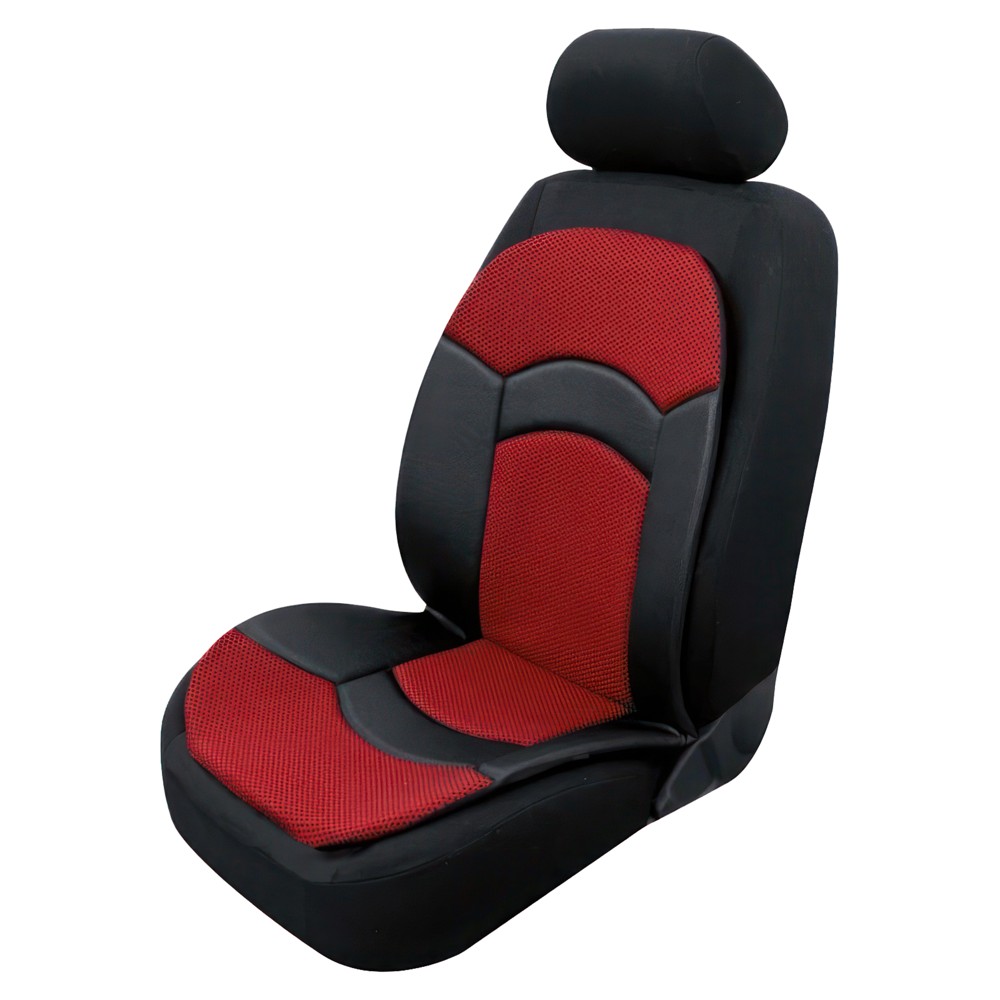 100% polyester. Jacquard knitted fabric combined with a leather look. Suitable for vehicles with side airbags. Universal size. Color: Red.