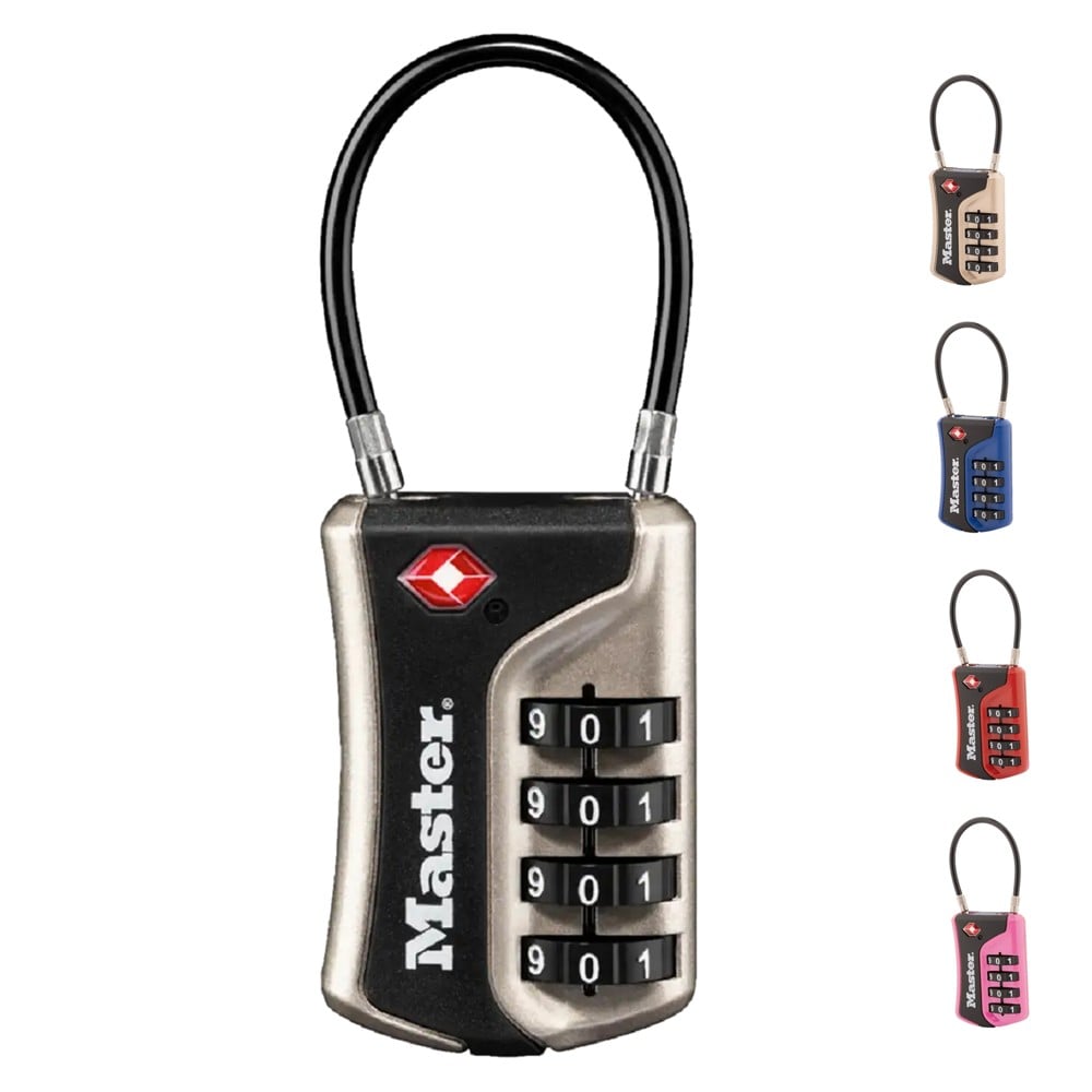 Masterlock padlock, Security level 4, 35mm padlock-zinc body-braided steel flexible cable vinyl cover, ø 3mm-3-resettable combi-4 col, Luggage