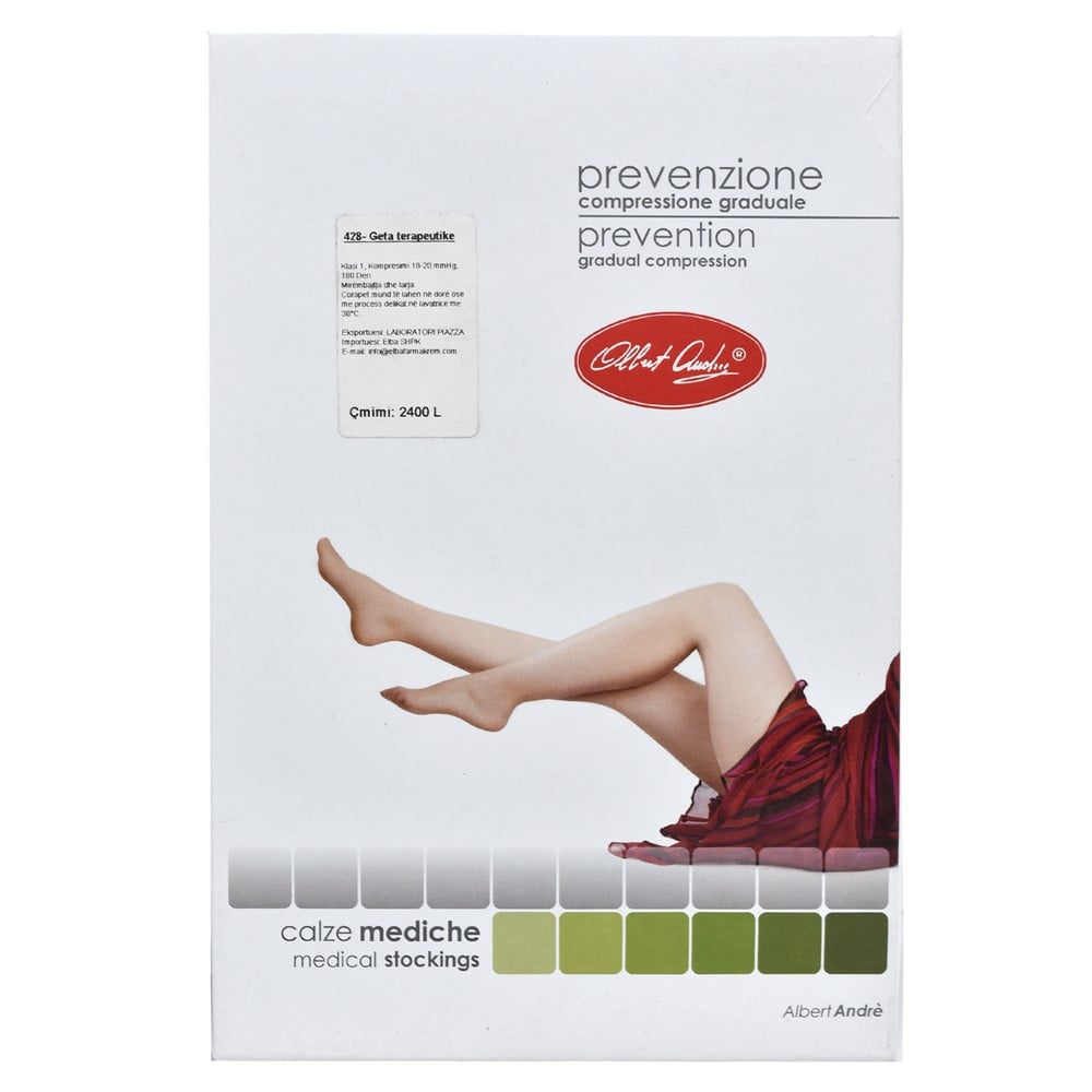 Medical compression stockings for women, model 428, made of elastic microfiber material, with a knitting density of 180 denier. The constituent material is soft, it makes the tights easy to wear and allows the foot to air out. How to use: Class 1 stockings (preventive 18-20 mmHg) have a low compression level and are suitable for use: 1. for the treatment of post-phlebitic syndrome, 2. for the treatment of mild venous insufficiency, 3. for the treatment of mild edema (trauma, distortions, collapse) of the lower arts, 4. as a preventive measure before and after surgery in patients at risk of phlebitis, 5. for the treatment of phlebitis, 6. as a complementary measure to sclerotherapy, 7. for the treatment of other pathologies according to the doctor's recommendation. Not to be used in cases of: 1. ulcers and wounds, 2. symptoms of dermatitis, 3. burns, 4. symptoms of allergy to the materials that make up stockings, 5. in all cases in which the doctor does not consider their use reasonable. Maintenance and washing: Frequent use and washing do not affect the functionality of the product. The stockings can be washed by hand or by a gentle process in the washing machine at 30°C. Should be dried away from any heat source (radiator, sun). Do not dry socks in the tumble dryer. Do not iron them.
