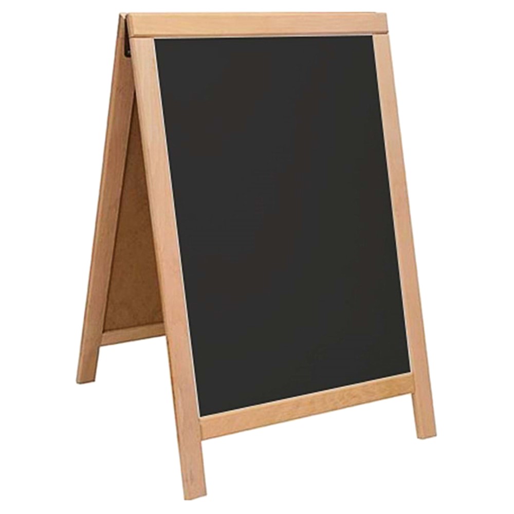 Two-sided menu chalkboard with stand, with a frame made of wooden material, with dimensions of 50x70 cm, which is suitable for writing with chalk. This menu chalkboard can be used by bars and restaurants to write various menus and daily offers, or it can be placed in large restaurants' hallways to display the guest list for a particular hall. This product is suitable for use by hotels, bars, restaurants, pizzerias, fast-food restaurants, etc.