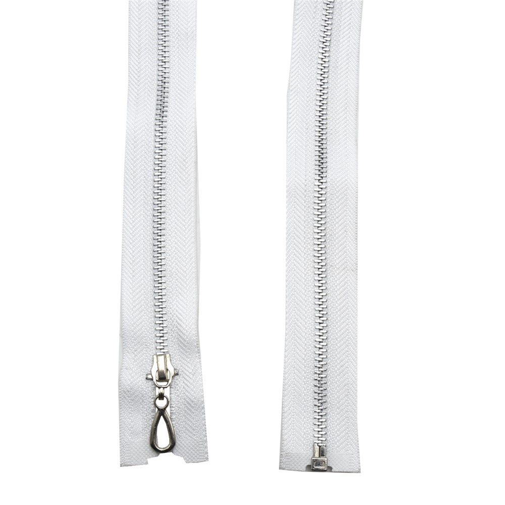 Zipper for various clothes, made of metal and polyester material, with dimensions of 60 cm in length, in white color. It can be used to sew on clothes using a sewing machine and it is suitable for use by tailors and stylists.