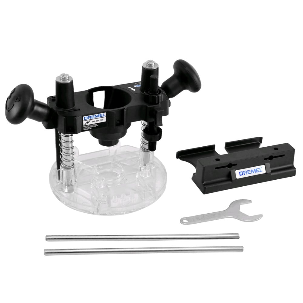 Plunge Router Attachment. Converts your Dremel tool into a plunge router to rout circles, signs and inlay work, decorative edges and to rout parallel to an edge. Plunge-lock in handle - simply turn handle to lock/unlock