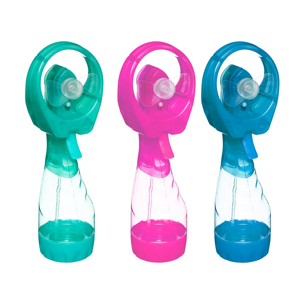 This mini water fan equipped with a fogging device will be ideal to cool you down on hot summer days. Simply fill the fan with water, roll it up and pull the trigger, and the fan will turn the water flow into fine drops. It is available in 3 colors: blue, pink or green. Works with 2 batteries LR6 - AA and has a capacity of 25 cl.