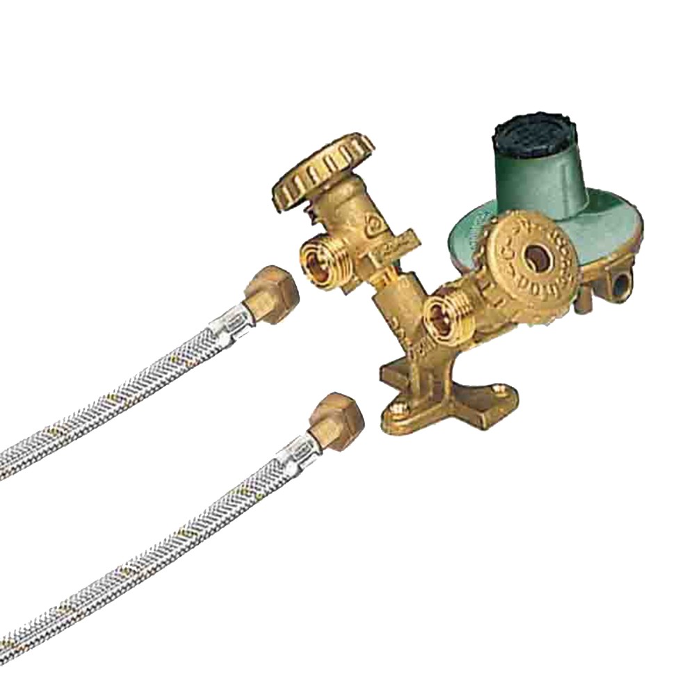 Mini gas collector set with flexible pipes and pressure regulator for gas cylinder. High quality bronze material according to standards.