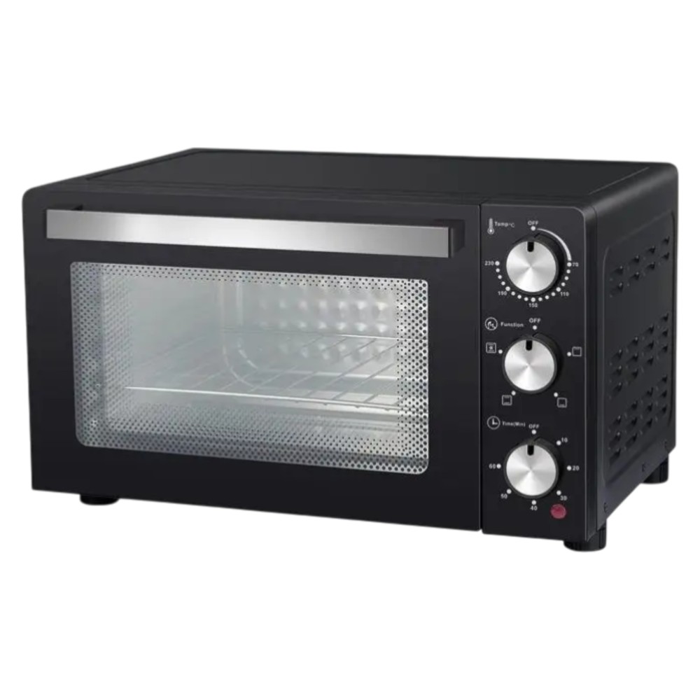 The DEVIL 32 convection electric oven offers a capacity of 32 litres, ideal for preparing a variety of dishes thanks to its basic cooking, grill, and combined functions. Equipped with an adjustable thermostat up to 230°C, this oven ensures even and precise cooking, supported by internal ventilation and a light that allows easy monitoring of food during cooking. The steel heating elements ensure optimal heat distribution, while the 60-minute timer with an acoustic signal allows for simple and safe setting of cooking times. The oven's design features double safety glass and thermally insulated outer walls, which improve energy efficiency and safety during use. It comes with three shelves for greater versatility, a power indicator light, and practical accessories such as a grill rack, a baking tray, and a handle for the baking tray. The stainless steel coating and black colour give it an elegant and modern look, while the 1500 W power and standard 220-240V supply guarantee high and reliable performance.