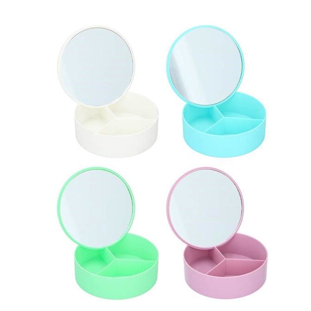 Circular mirror, with cosmetic holder, which is used to hold makeup accessories. This product is suitable for personal use for face care and makeup. It can be taken anywhere with it thanks to its small size