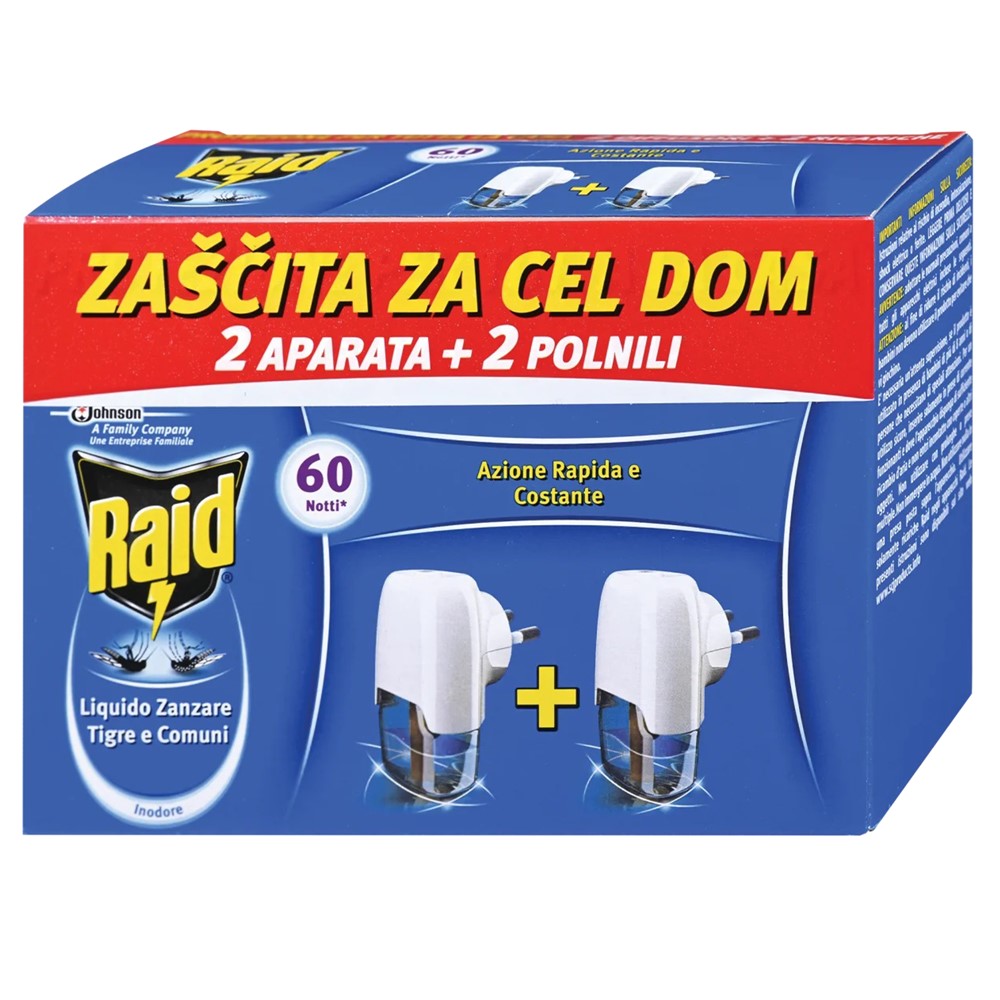 The Raid® liquid electric appliance provides day and night protection against stubborn mosquitoes. Protects areas up to 30 m2 without emitting smoke or odors. There is no need to additionally spray the room and change the filling every night. Charging the braces takes up to 30 days, if used for a maximum of 8 hours a day. The fluid level is easy to monitor. When the bottle is empty, simply replace it with a new one. The Raid® electrical appliance package comes with 2 charges.