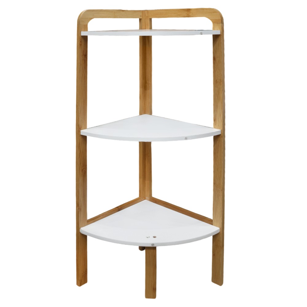The multifunctional shelf "Miki" with bamboo wood structure is the ideal solution for environments with high humidity thanks to the properties of bamboo wood. With a triangular shape and three levels for placing your items, this shelf fits easily in the corners of your home, making it very practical. The minimalist design and arched shapes will give a modern look to your home. Dimensions, height 74 cm x length 29 cm x width 29 cm.