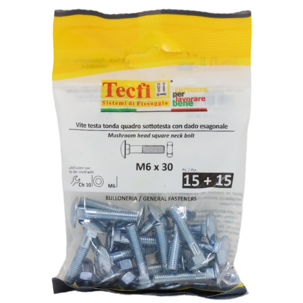 Mushroom head square neck bolt w/hex nut, 4.8, zp, M6x30mm, Bag 15