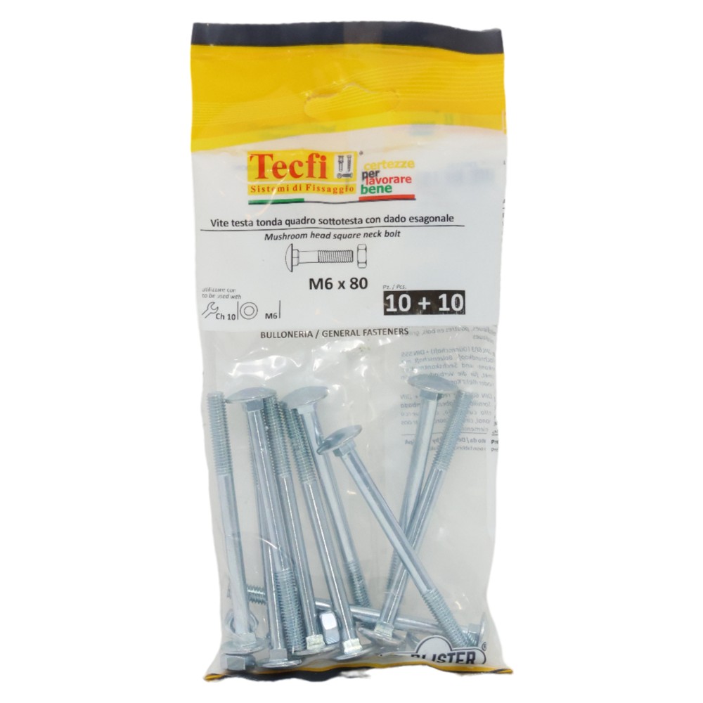 Mushroom head square neck bolt w/hex nut, 4.8, zp, M6x80mm, Bag 10