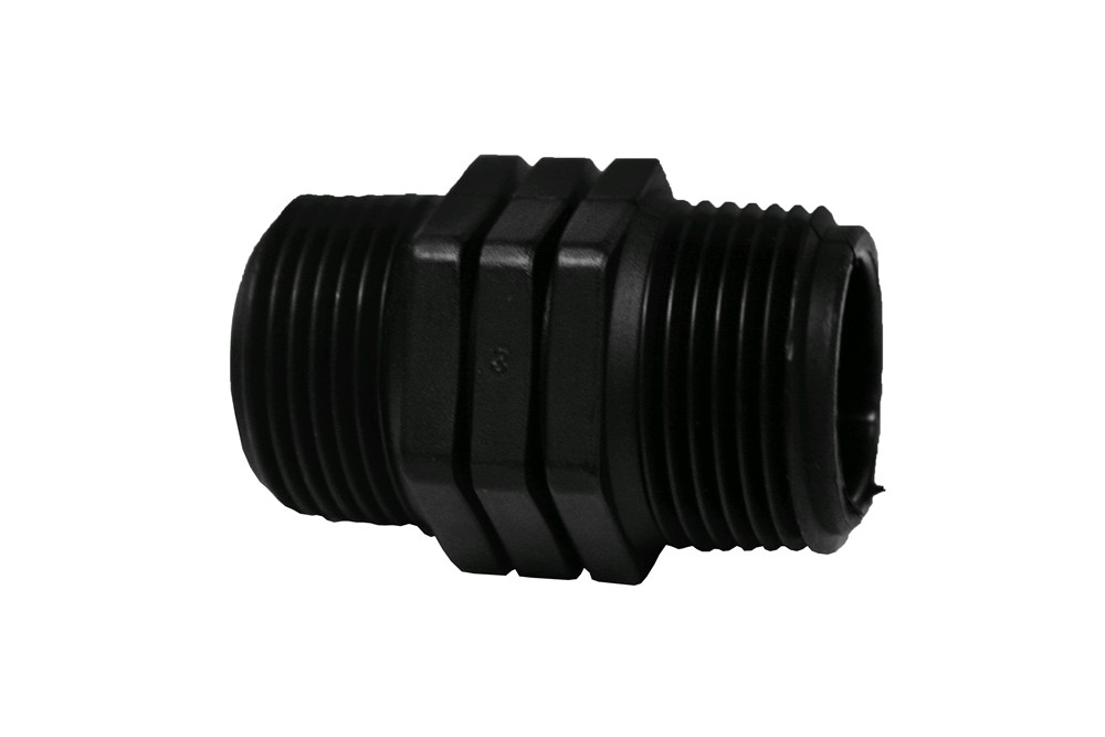 Nipple of PP 3/4" male. Used to installations water supply infrastructure lines, in irrigation and agricul, etc. Nipples with male fillet enables joining the network of pipes or different fitting threading through, for joining the fillet recommend tu use teflon. Manufactured with European standards, resistant to corrosive materials designed to withstand pressure up to 6 Bar.