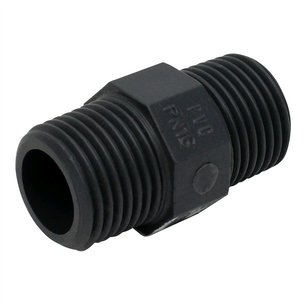 Nipples 1/2" of PVC. Used to installations industrial water lines, irrigation line etc. Nipples with male fillet enables joining the network of pipes or different fitting threading through, for joining the fillet recommend tu use teflon. Manufactured with European standards, resistant to corrosive materials designed to withstand pressure up to 16 Bar.