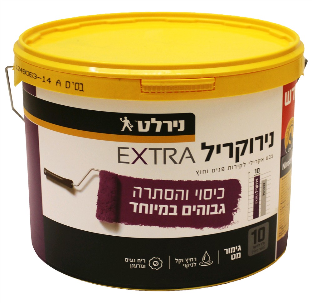 Acrylic paint Nirocryl white acrylic paint Base A 10 L. A superior quality water-based matt acrylic paint with high opacity and high spread rate. Intended for painting interior and exterior walls. Creates a particularly velvety finish giving the walls of a house a smooth, fresh and elegant appearance. Durable over time and retains its new look. Meets the exterior durability requirements of the Israeli Standard Mark 1945. Properties: Excellent wet opacity (opacity visible immediately during the application). Good resistance to wash, scrub and mechanical abrasion. Not spattering during the application, particularly easy when painting ceilings. Excellent leveling and flow properties, easy to work with. Typical Uses: For painting interior and exterior walls, plaster, concrete, cement boards, plaster boards and more after a suitable preparation of the surface. Surface Preparation: Clean the surface well to remove any foreign material such as old whitewash, dust, peeling paint, grease etc. Make sure the existing paint left on the wall is firmly attached to the surface. Remove loose paint with a spatula and sandpaper. Repair the surface if needed with Gold Bond American Putty, Maximo Crack Filler or Altek Violet, after drying sand to obtain a smooth and homogenous surface. Apply a suitable primer such as Primer S for interior walls and Bonding Primer for exterior. To fix and strengthen sandy or old surfaces apply Primer X. Application: Stir the paint well before use. Apply by a brush, roller or a sprayer in 2 coats. Await 2 hours between coats (under regular weather conditions). Do not apply when the temperature is below 7 °C. Colour: Extra White + shades of the Nirlat Colour Is or RAL fan deck. Finish: Matt. Coverage: 13 m²/L in 2 coats (in full opacity). Dilution: with water, 20 % first coat, 10 % second. Cleaning of hands and tools: with soap and water immediately after use. Dry time: To touch: 1 hour. To recoat: 2-3 hours. Full cure: 24 hours.