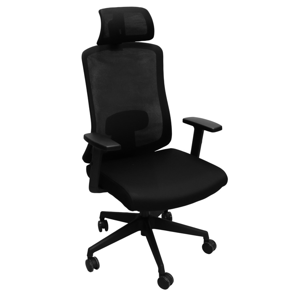 A modern and functional office chair, equipped with wheels for easy mobility and supportive armrests that provide comfort during work. The durable plastic structure is combined with nylon wheels to ensure smooth and safe movement. The mesh backrest offers optimal ventilation and ergonomic support for the spine, while the textile upholstery guarantees comfort even during long-term use. The black color gives it an elegant and professional appearance, suitable for any office environment. With dimensions of 49x49 cm and an adjustable height ranging from 115 to 125 cm, this chair offers flexibility and adapts to the user’s needs.