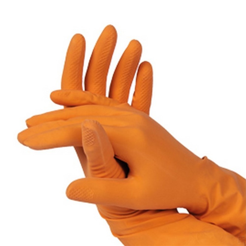 Cleaning gloves with 100% natural latex anti-slip material, in orange color. The material is soft to the skin and does not cause irritation. This product is suitable for home use, for protection from minimal risks.
