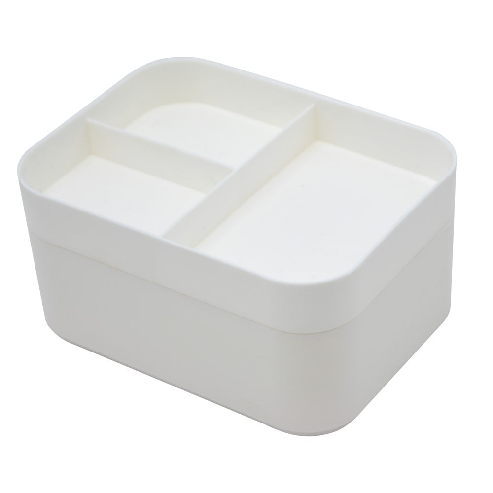 Make up organizer, size 15x12x8.5 cm, made of polypropylene material in white and black, with 3 compartments. Used for organizing cosmetic accessories in drawers.