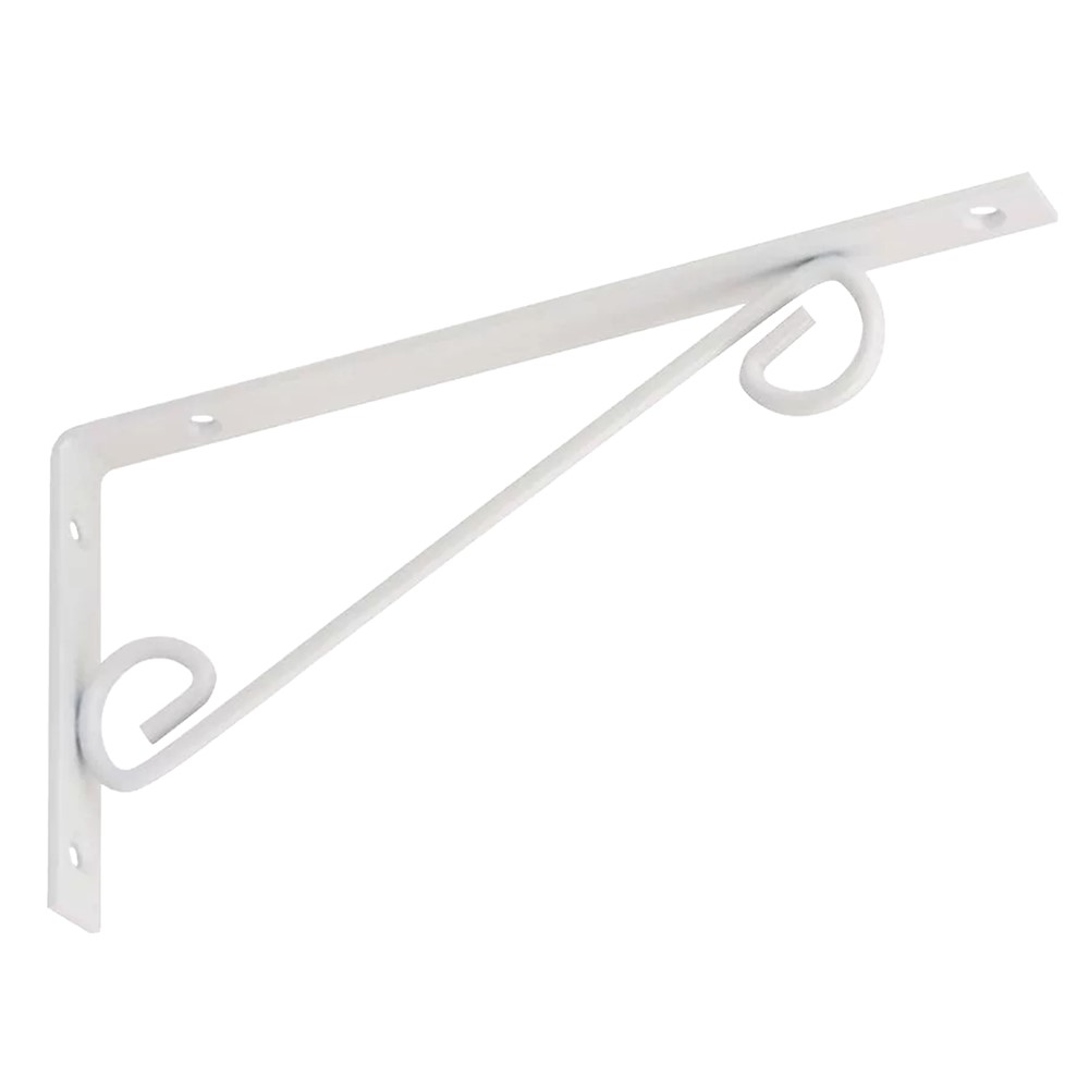Ornamented shelf bracket, made of sturdy steel material, in white color, with dimensions of 25x12.5 cm, which serves as a decorative and functional accessory for various environments. The constituent material is resistant to use, heavy weights, rust or abrasion. It is used for wall mounting of self-supporting shelves, but it can also find other applications in professional and non-professional environments.