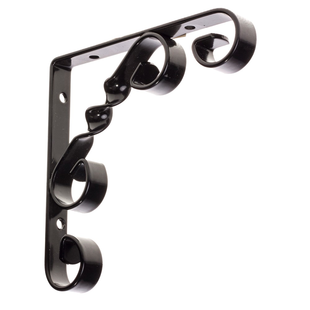 Ornamented shelf bracket, made of sturdy steel material, in black color, with dimensions of 10x10 cm, which serves as a decorative and functional accessory for various environments. The constituent material is resistant to use, heavy weights, rust or abrasion. It is used for wall mounting of self-supporting shelves, but it can also find other applications in professional and non-professional environments.