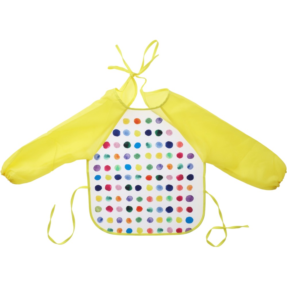 Clothing apron for children. No more dirty clothes while crafting! The apron measures 55 x 37 cm and is suitable for toddlers and preschoolers from 3 to 6 years old. The apron can be closed with a tie at both the back and the neck. The apron has bright yellow sleeves and a creative print of colored paint dots on the chest and stomach.