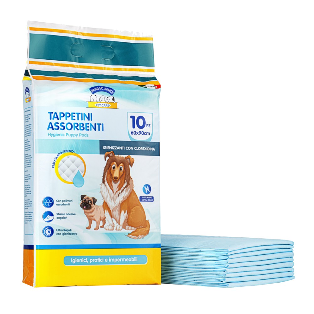 Super absorbent mattresses with chlorhexidine. The upper layer is composed of cellulose which guarantees maximum absorption and a better distribution of liquid and polymers that prevent the formation of bad odors. The waterproof bottom layer prevents any spills. The presence of adhesives in the corners guarantees adhesion and fixation to the floor. Ideal for training the puppy in a specific space for needs, to keep your pet in the car, under the bowl, as a kennel base and pet carrier.