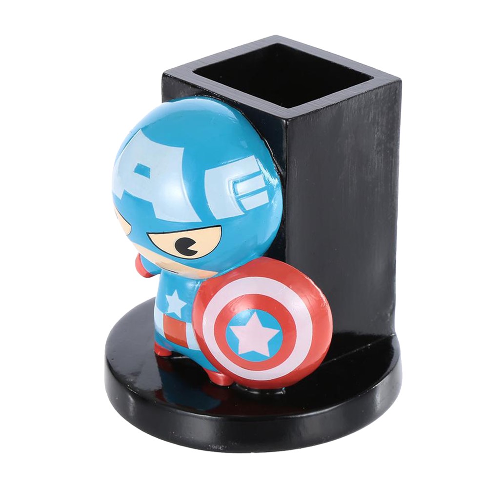 Pen stand with Captain America figurine, made of resin material, with dimensions of 8.8x8.8x9.2 cm, in red, blue and black color. The pen stand is used to store pencils, colored pencils, pens or other stationery accessories, while avoiding clutter, or it can be used as a decorative object for children’s bedrooms, which can be placed on study tables, bookshelves or bedside tables. This product is suitable for use by children over 3 years old.