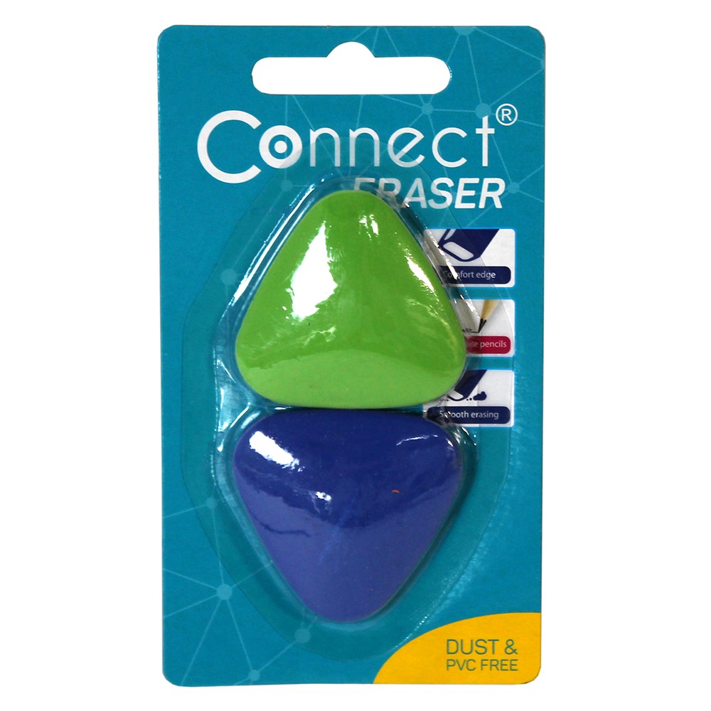 Pencil erasers set, made of soft rubber material, in triangular shape and in different colors. They are used by children in schools and kindergartens, to erase mechanical pencil marks and pencil marks from various drawings, sketches or notes. The erasers have an ergonomic design, are easy to use and leave no marks on paper or cardboard surfaces after use. This product is suitable for children over 4 years old.