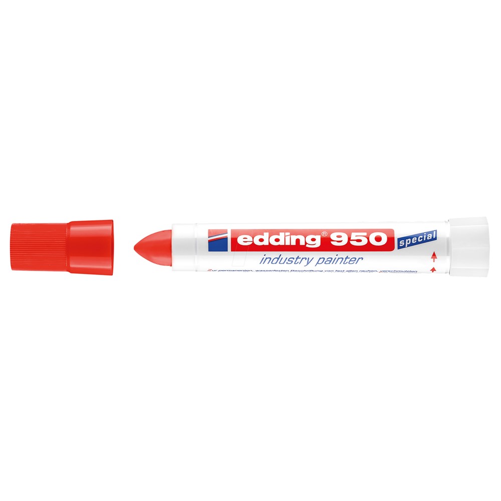Permanent industrial marker, 950, made of plastic material, with dimensions of 21 cm in length, in red color, equipped with a bullet-shaped tip, with a tip thickness of 10 mm. It serves to make permanent notes particularly on rough or wet surfaces, contaminated materials, rusty metals, to write on clean underwater surfaces, on slightly oily or greasy surfaces. It can be used by merchants and electricians, by divers to mark parts of a ship under water, by engineers to mark concrete and masonry goods, timber, in agriculture and forestry, in bridge constructions, etc. The ink is extremely durable, it is waterproof and it leaves no stains. This product is lightweight and practical to use and it is resistant to water and high temperatures up to 300 ° C. The ink cartridge can be refilled and reused.