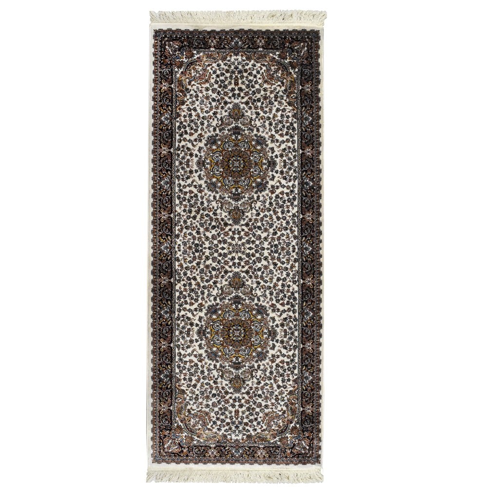 Persian rug made of polyester. The classic beige design focuses on the central emblem where the base is cream (or lighter beige). Cotton fringes and a very high density of 1 million 200 thousand knots per square meter give this rug quality and longevity. Thanks to the density, the rug is safe from impurities because if it is cleaned immediately, they will not be able to penetrate to its base. Pile high 6mm. Recommended to wash professionally.