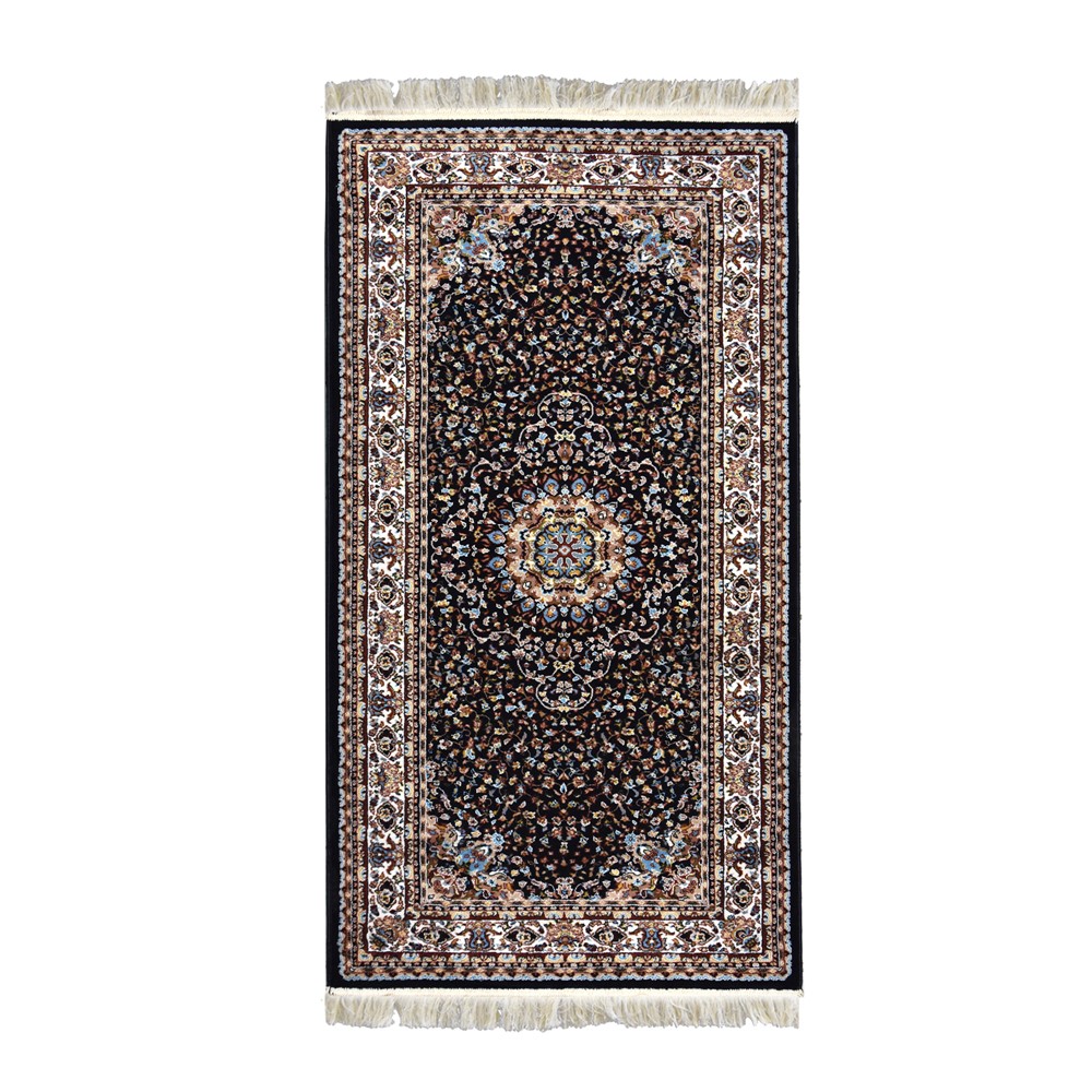 Persian rug with all polyester composition. The dark brown color with a classic design focuses on the circular emblem and the frame which completes the design very nicely. The rug is worked out to the last detail. Cotton fringes and a very high density of 1 million 200 thousand knots per square meter give this rug quality and longevity. Thanks to the density the rug is safe from dirt as if cleaned immediately they fail to penetrate to the base of the carpet. Pile high 6mm. Recommended to wash professionally.