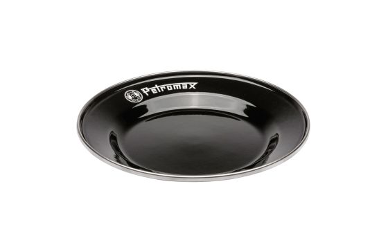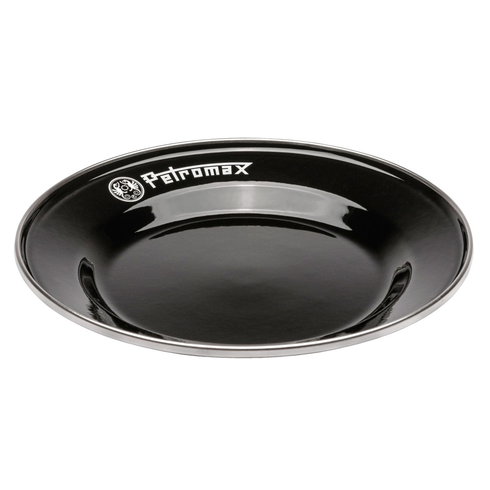Petromax Black Enamel Camping Plates have a hard black enamel finish with the Petromax twin dragon logo and a stainless steel rim. The combination of glass and steel results in a strong and easy to clean material, it is not only heat resistant but also lightweight. The combustible surface is resistant to scratches and cuts. Used for camping, by the fire or at home.