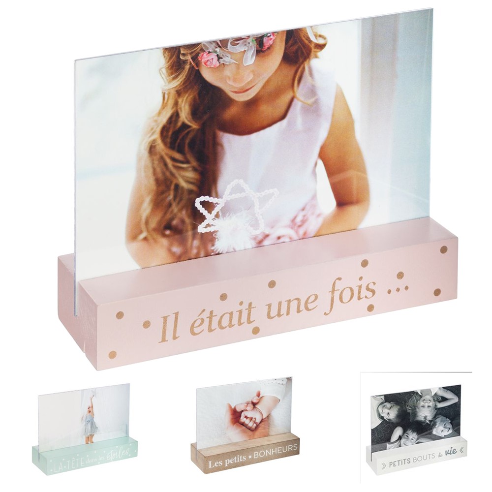 Holder - photo frame. It is ideal for use in a children's room for girls. The lower base is made of wood material and the upper part is made of transparent plastic in which the photo is placed.