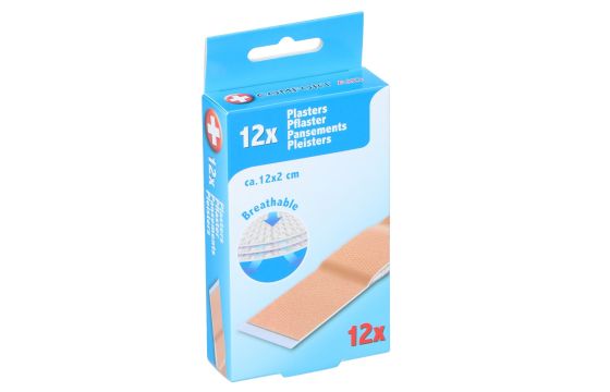 First aid bandage made of polyvinyl material in a rectangular shape, in brown color, Used to bandage small wounds, scratches, etc. Used for travel, home and car. The set contains 12 pieces.