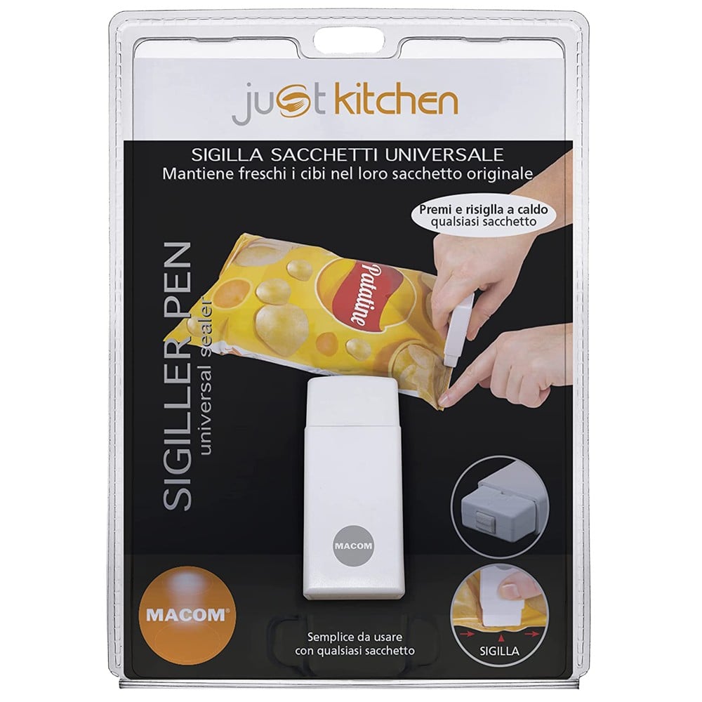 Universal bag seals with a patented system that allows you to close and re-close kilometers and kilometers of bags, preserving the freshness and flavor of foods in their original bag for longer. Battery operated. With protective cap. Simple to use with any bag.