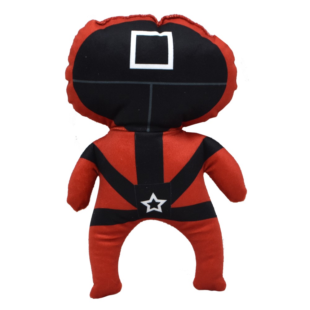 Plush toy for kids, in Squid Game design, made of soft synthetic polyester material, in red and black colors. It is used as a way of entertainment for children, as a decorative object for children's bedrooms or as a gift for children or adults.