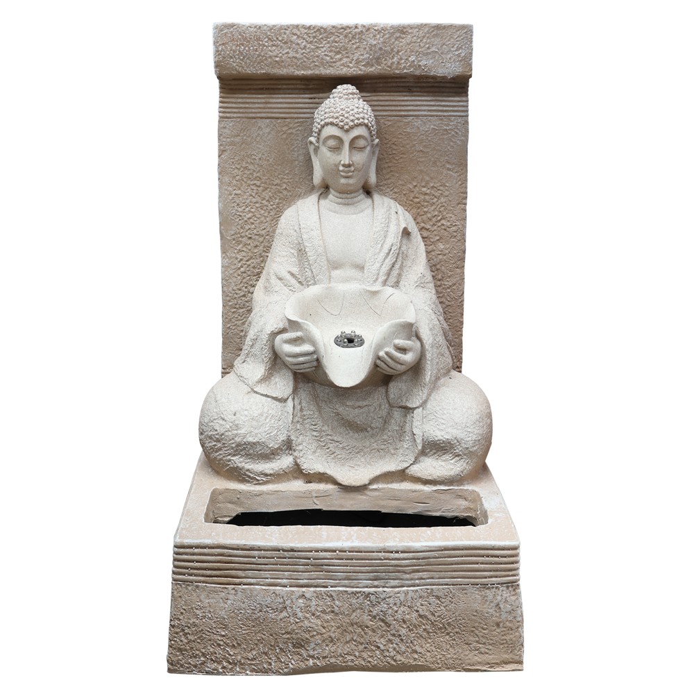 Polyresin fountain "Budha", W/ONE LED with water pump 10m cable. Product size:30x33x51cm. They have the appearance of natural stone. To add a relaxing and beautiful element to your surroundings and to bring nature near you, this fountain is the solution. They can be placed inside or outside.