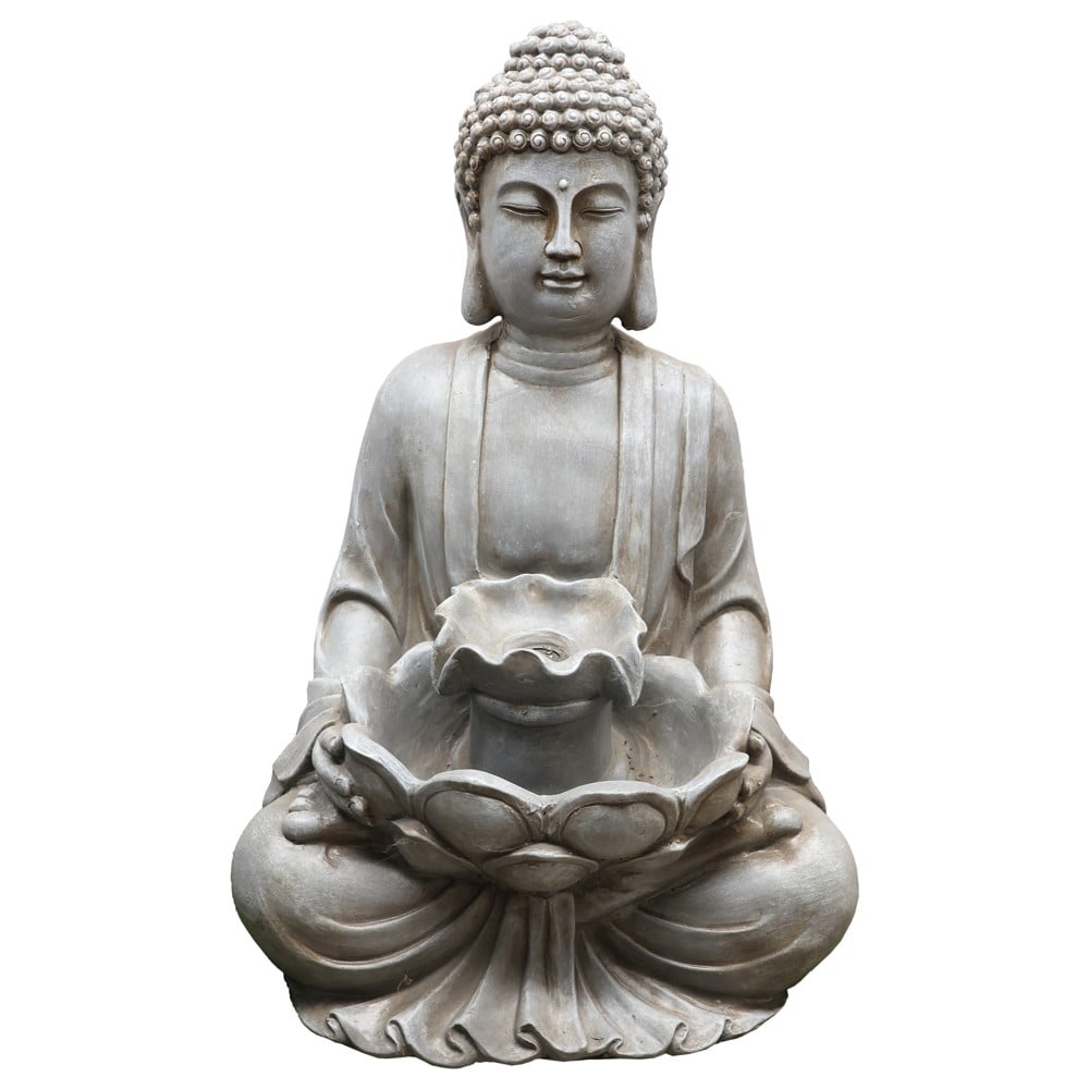 Polyresin fountain "Budha", W/one LED with water pump 10m cable. Product size:48x41x72cm. They have the appearance of natural stone. To add a relaxing and beautiful element to your surroundings and to bring nature near you, this fountain is the solution. They can be placed inside or outside.