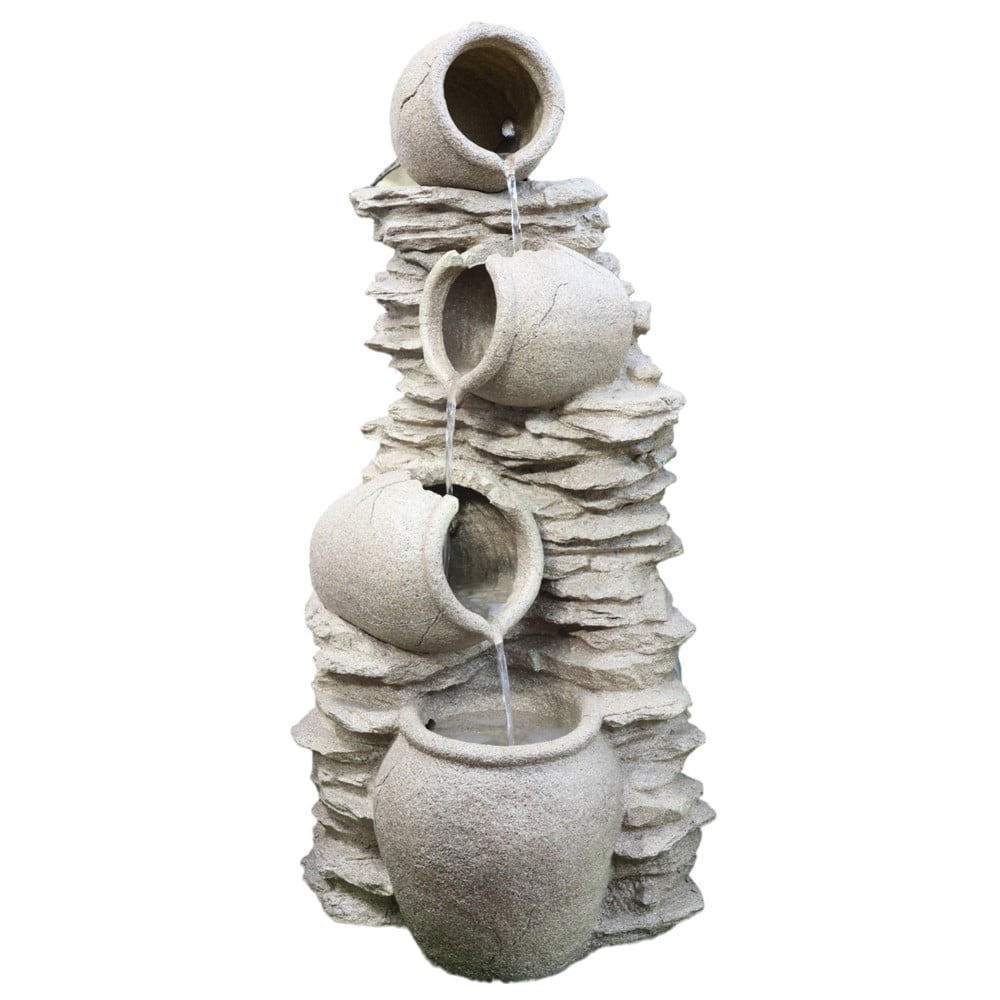 Polyresin fountain W/four LED with water pump 10m cable. Product size: 60x47x118cm. They have the appearance of natural stone. To add a relaxing and beautiful element to your surroundings and to bring nature near you, this fountain is the solution. They can be placed inside or outside.