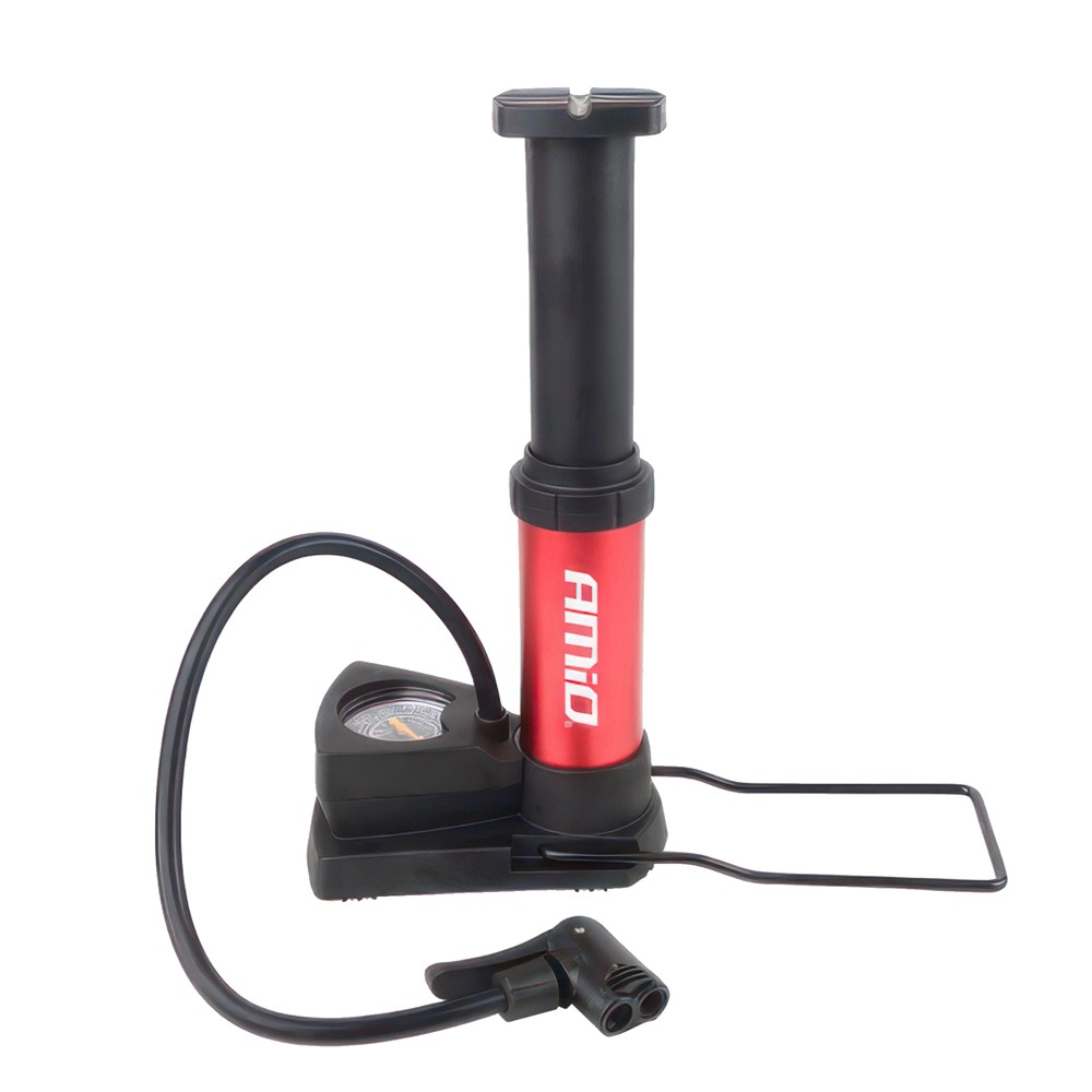 Strong metal foot pump with a maximum pressure of 11 BAR / 160 PSI. Easyly to use, and and thanks to its small size, easy to transport and store. It has a double universal head for car and bicycle valves. Additionally, an adapter and needle for pumping mattress, balls, inflatable toys etc. are included. made of aluminium and durable plastic a solid base makes it easier to hold the pump with your feet a 40 cm long wire pump height: 27 cm dimentions after folding: 17.5 x 9 x 9.5 cm