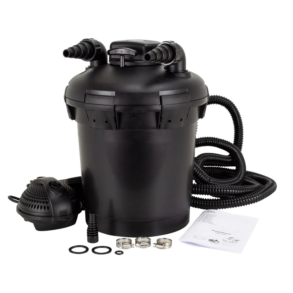 Pressure filter sets with clear water for ponds up to 10000 l content (without fish trimmings). Includes bio-mechanical filter media and integrated 7 watt UVC precleaner. Powerful filter pump (2500 l/h) with 4 mm openings and 5 m hose. The purified water can be directed up to 2 m into the height and run a stream. Unique, convenient cleaning mechanism for filter media maintenance.