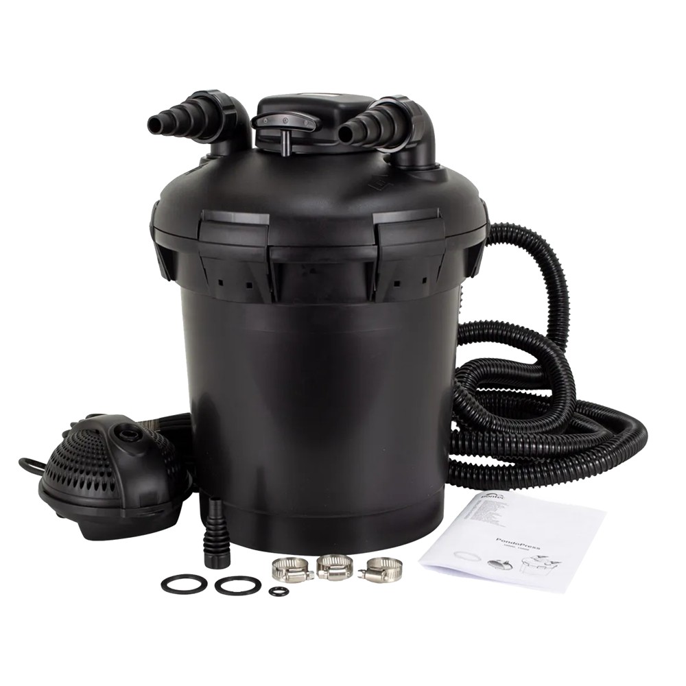 Pressure filter sets for ponds up to 15000 l content (without fish trimmings). Including bio-mechanical filter media and integrated 11 watt UVC precleaner. Powerful filter pump (2500 l/h) with 4 mm openings and 5 m hose. The purified water can be directed up to 1 m into the height and run a stream. Unique, convenient cleaning mechanism for filter media maintenance.