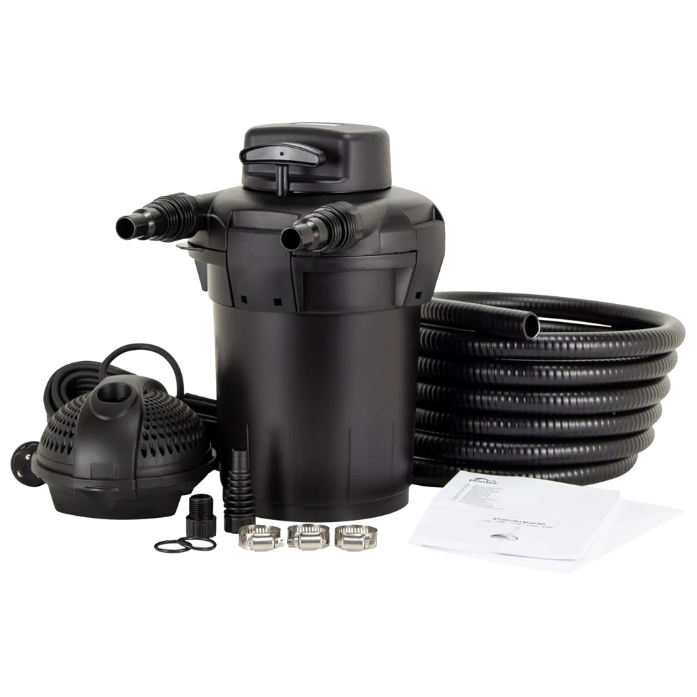 Pressure filter sets with security on clear water for ponds up to 5000 l content (without fish). Including bio-mechanical filter media and integrated 7 watt UVC precleaner. Powerful filter pump (1500 l/h) with 4 mm holes and 5 m hose. The purified water can be up to 2 m in height and a stream. Unique, comfortable cleaning mechanism for the filter media maintenance.